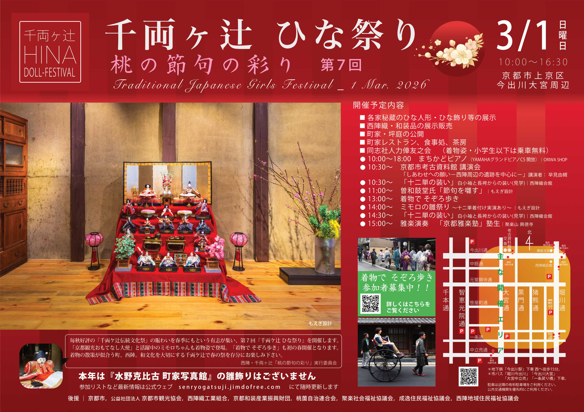 | 主催・問い合わせ | 主催:西陣・千両ケ辻「桃の節句の彩り」実行委員会 お問合せ:ウェブサイトのフォームから |