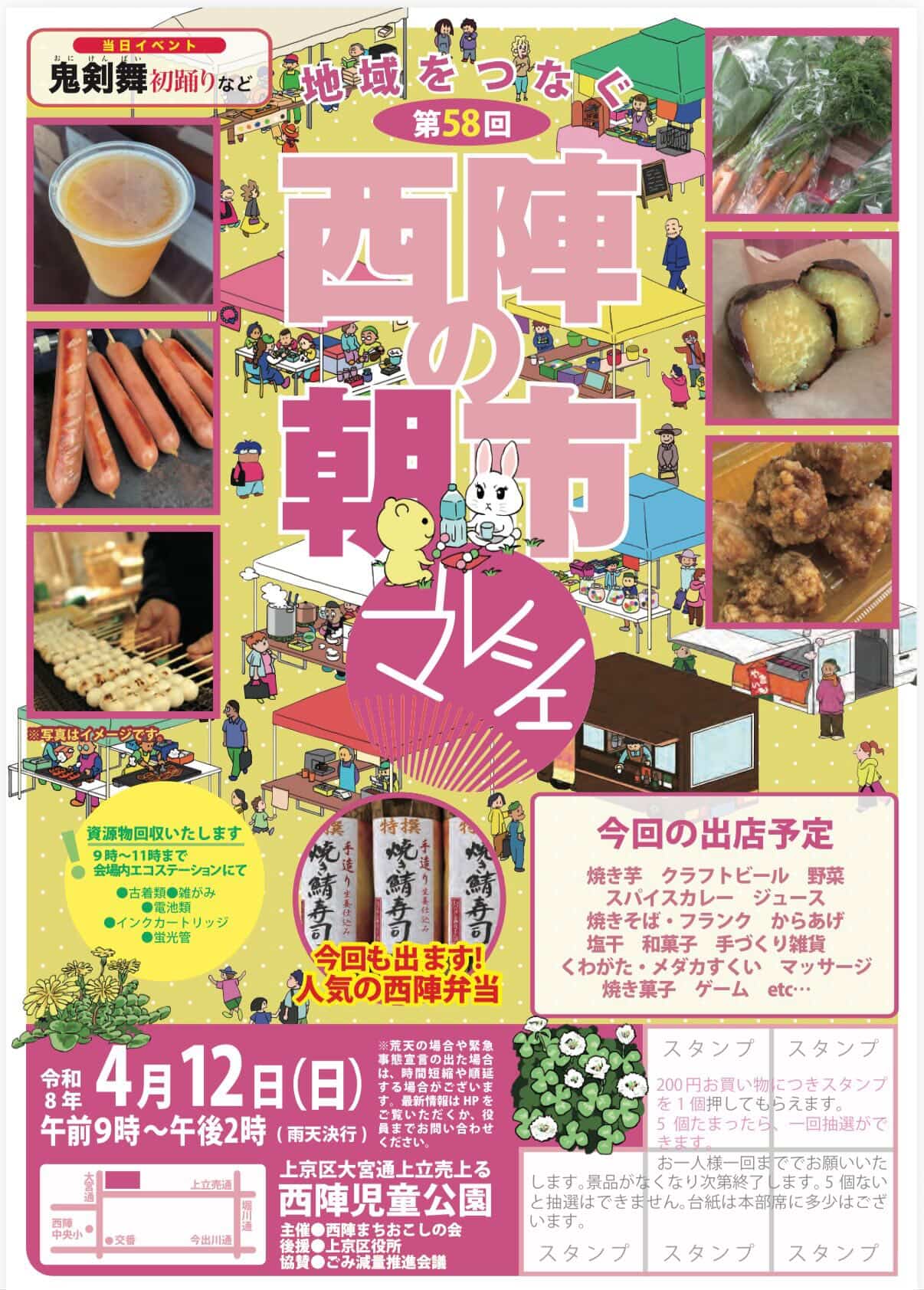 上京区の成逸、西陣、桃薗、聚楽の4学区の小学校統合を機に「西陣まちおこしの会」というまちおこし活動を行う団体が結成され、その会が中心となり、夏祭りの時期を除き2ヶ月に1回開催しています。