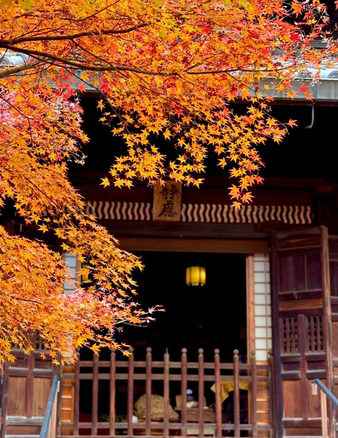 紅葉の隙間から姿を現す静かな御堂。