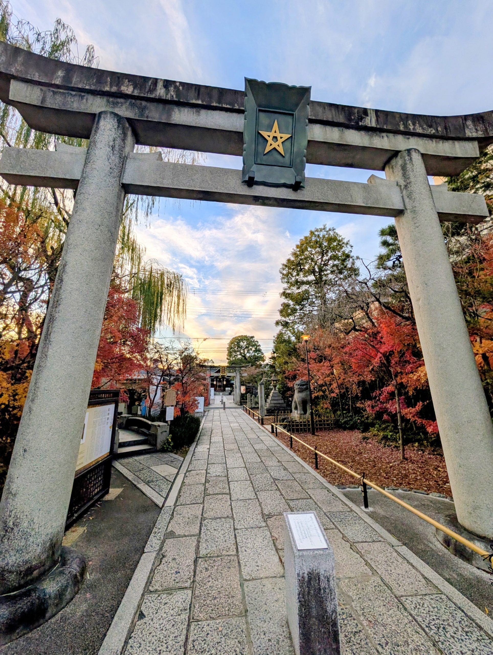黄金色に輝く夕暮れの北野天満宮と、鮮やかな朱色に染まる