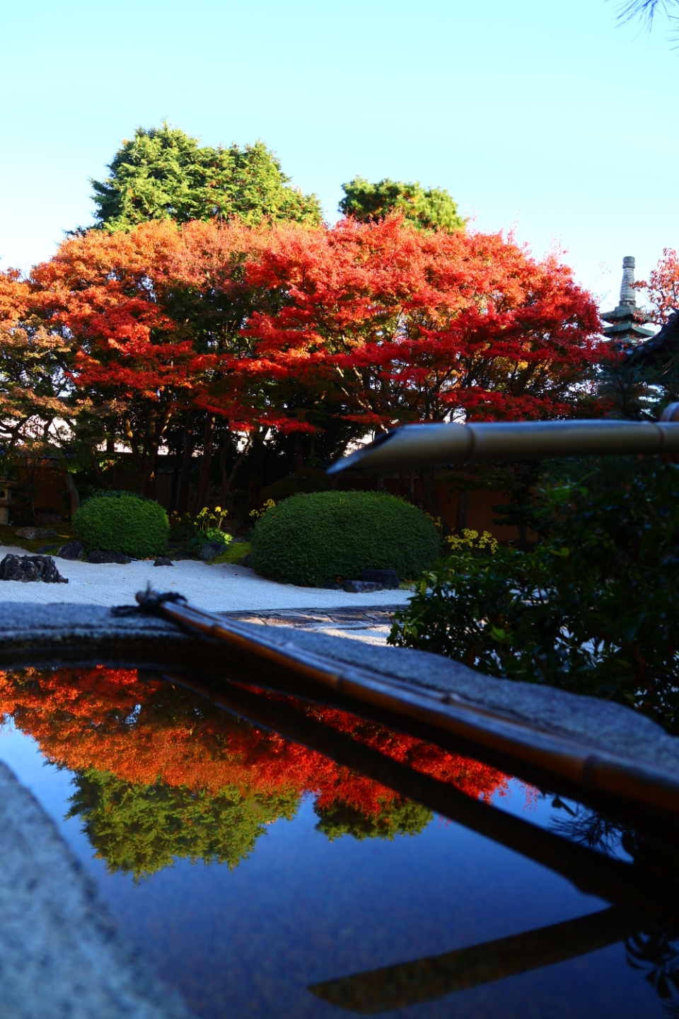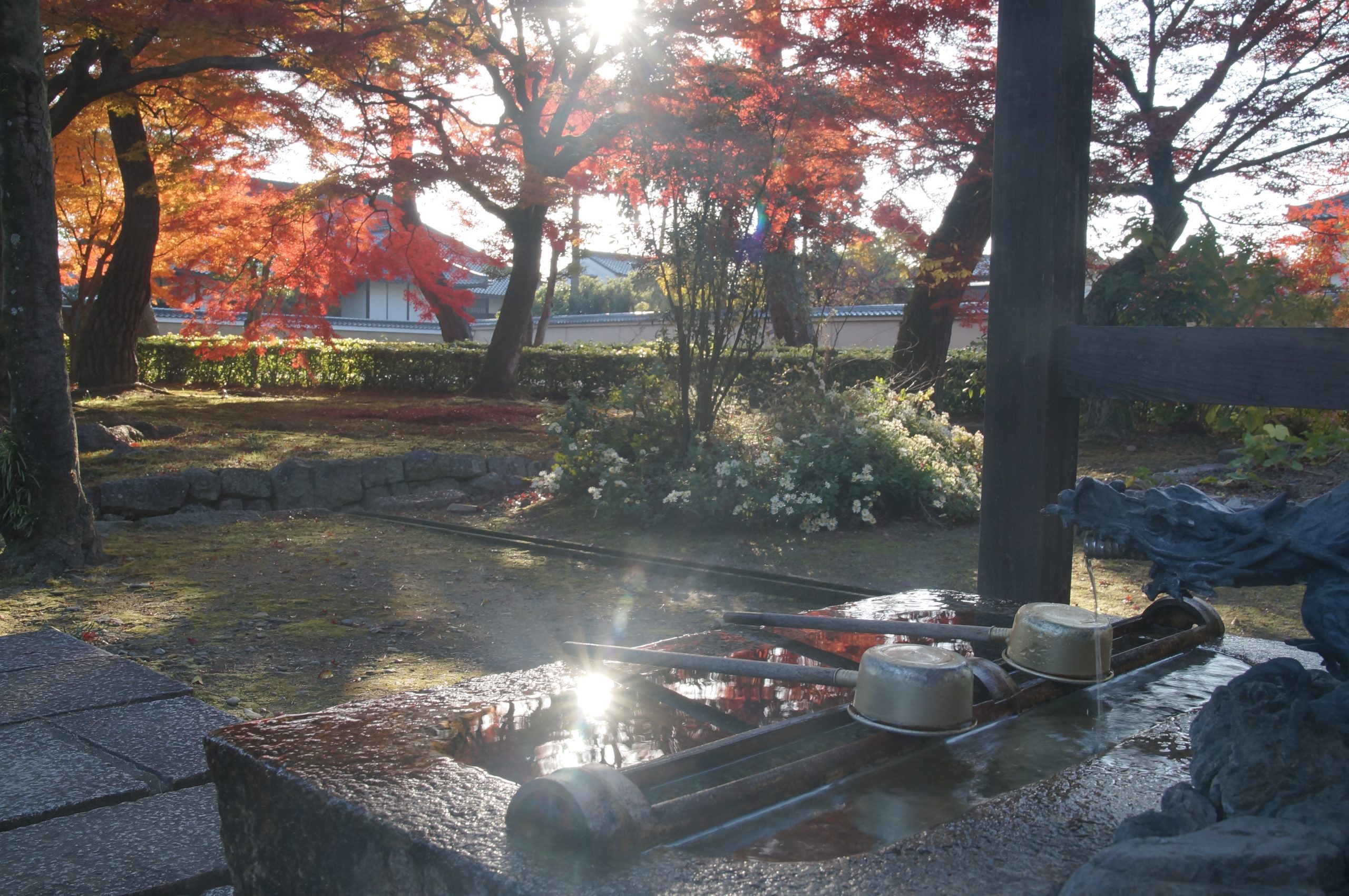 紅葉が散り始めた相国寺、手水に光条を収めて撮影しました。